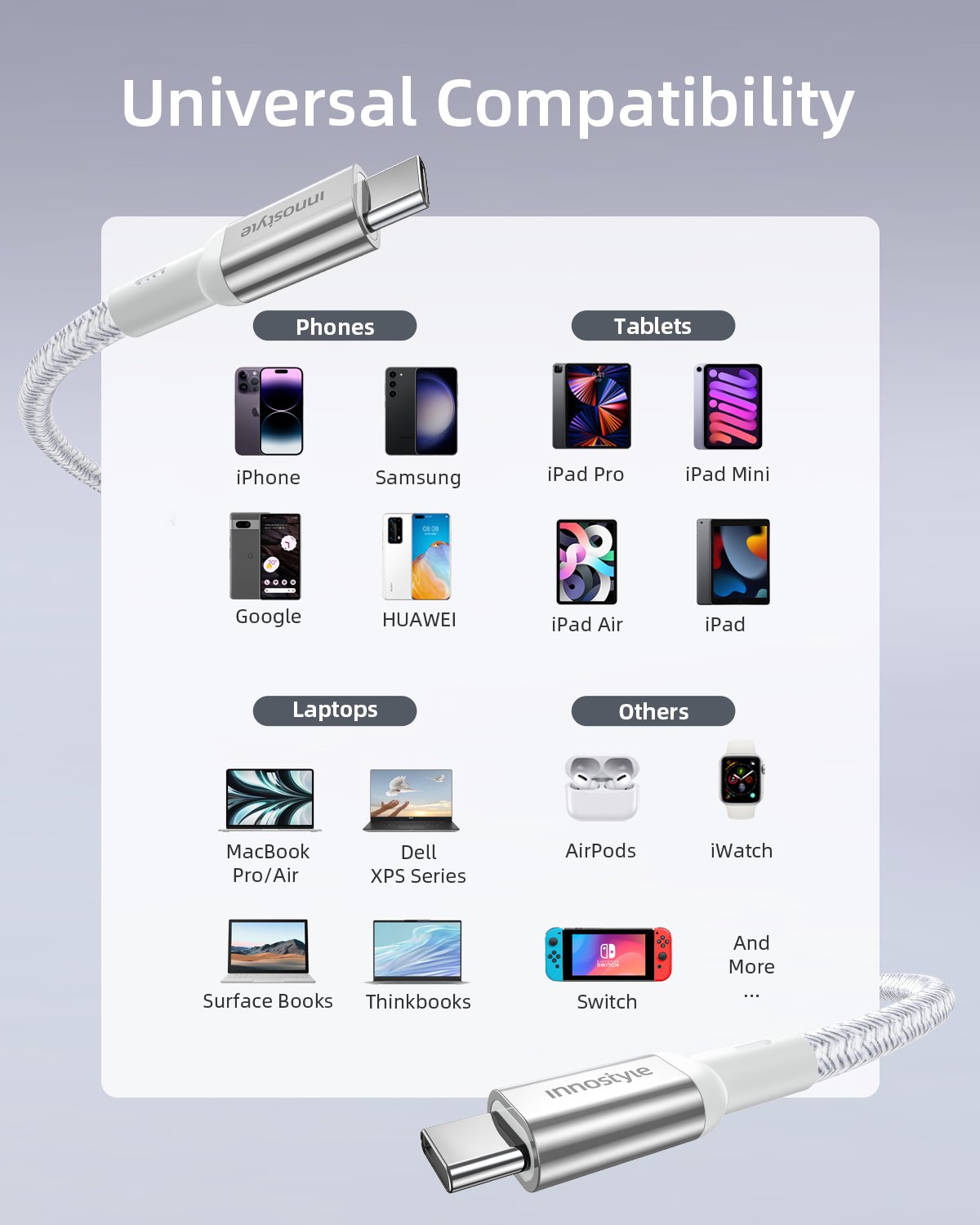 Tương thích USB-C đa năng: Cáp PowerFlex Ultra USB-C to USB-C tương thích với MacBook Pro 16″ 2023 (M2 Max), MacBook Pro 15″, MacBook Pro 13″, MacBook, MacBook Air 2022, iPad Pro 2022, Google Pixel 7 Pro/7/7a, Samsung Galaxy S23/S22/S21/S20, Nexus 6P 5X, PS5, Nintendo Switch, Huawei Matebook X Pro/Matebook, Chromebook, Dell XPS 15, Yoga 900/720, ThinkPad X1, Razer Blade Stealth, ASUS ZenBook, HP Spectre notebook, Alienware m16/m18, và nhiều thiết bị khác.