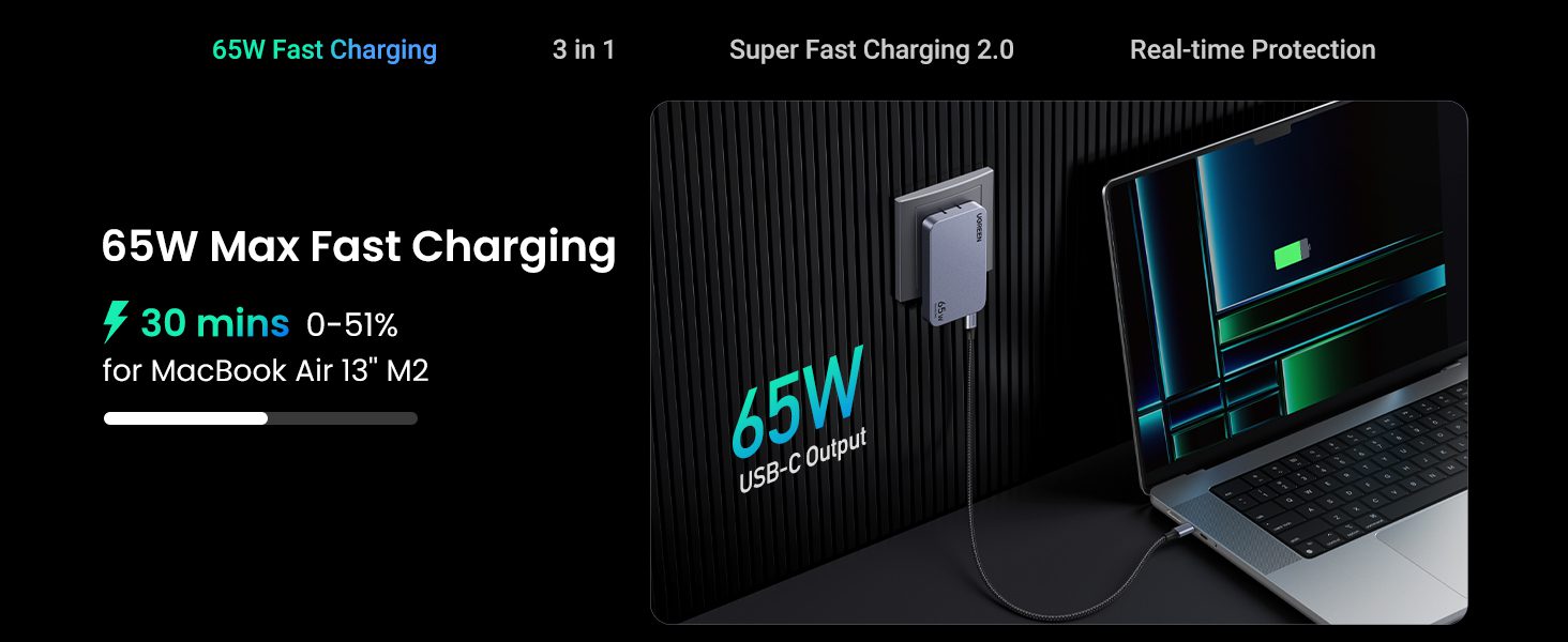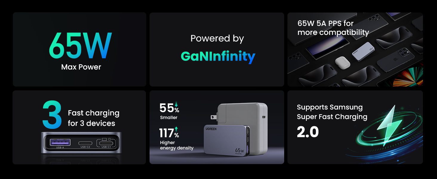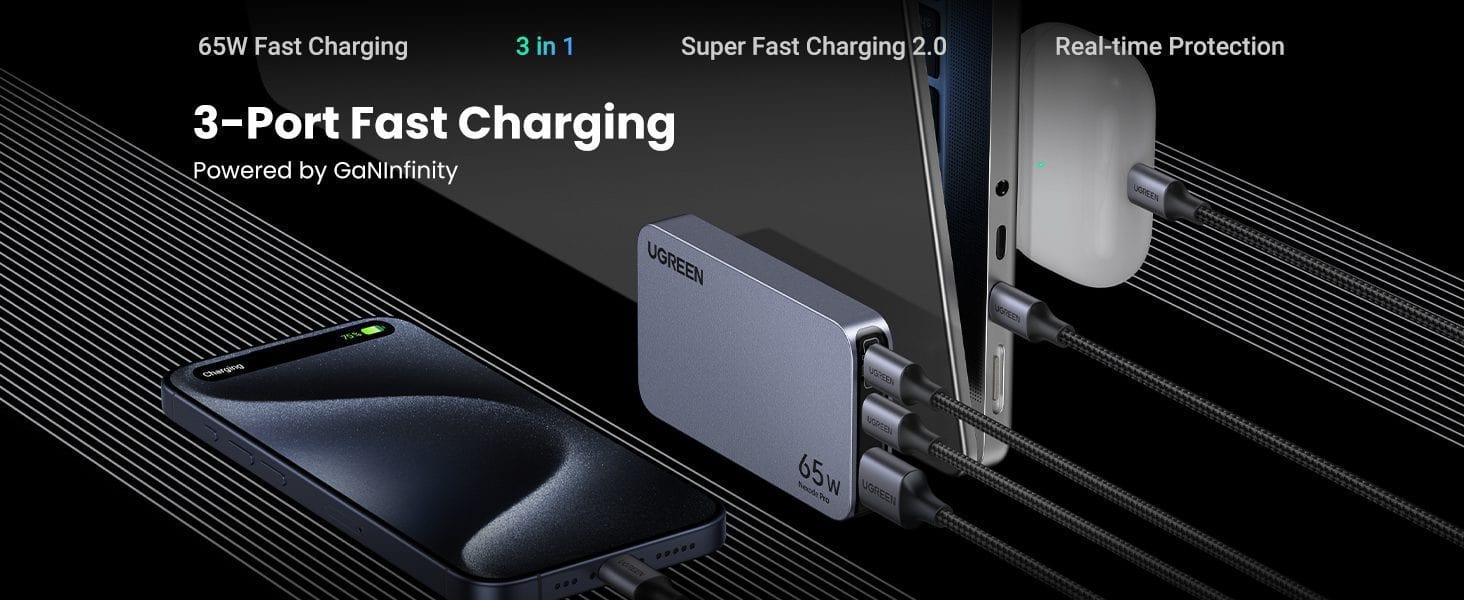 Củ sạc Type C 65W UGREEN Nexode Pro X753 GaN Ultra-Slim cung cấp sạc nhanh cho hầu hết tất cả điện thoại, máy tính bảng và laptop USB-A và USB-C.