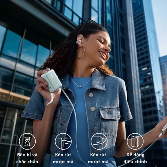 Sạc nhanh chóng chỉ với một thao tác kéo cáp rút gọn tích hợp, bền bỉ với khả năng chịu hơn 20.000 lần uốn cong. Giữ dây gọn gàng, tránh rối và sạc hiệu quả mọi lúc.