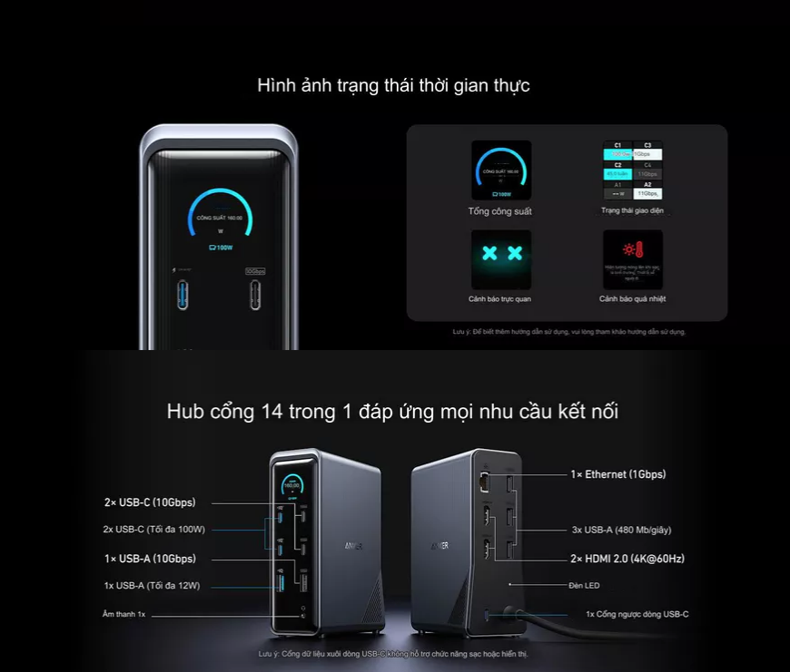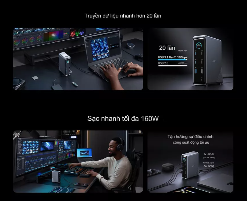 Hiệu năng vượt trội: Công suất 160W và hỗ trợ nhiều cổng giúp bạn sạc và kết nối đồng thời nhiều thiết bị mà không ảnh hưởng đến tốc độ.